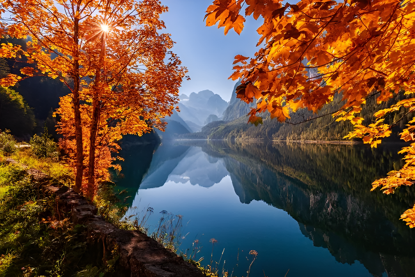 A woman with dark curly hair, wearing a light gray sweater, sitting at a dark wooden table outdoors near a lake with calm water and overhanging trees.